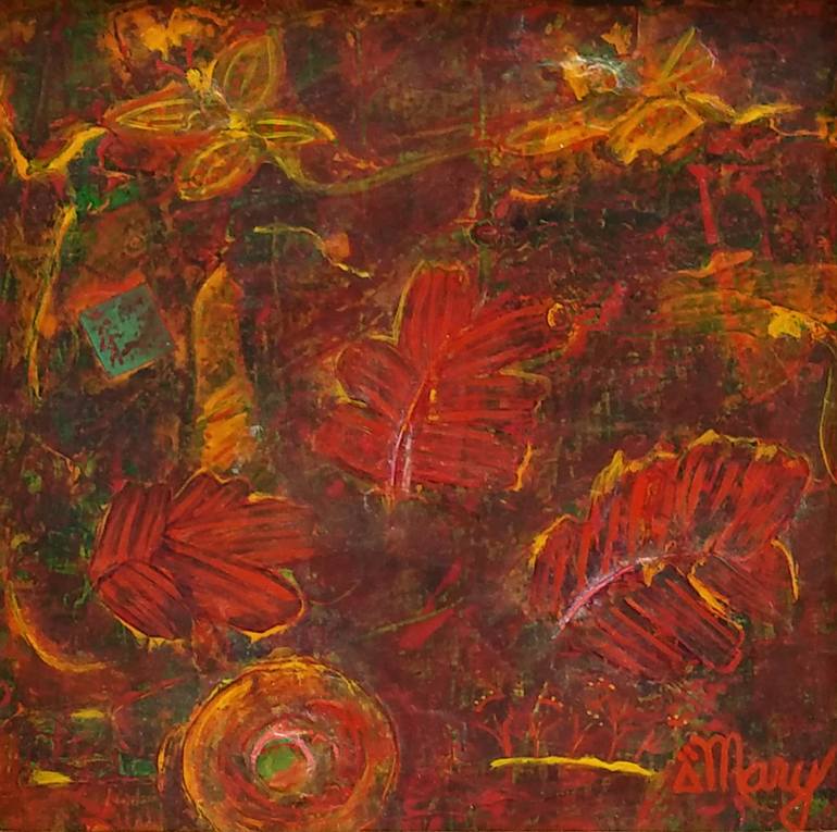 Butterflies glide above the feather flowers reaching for the sun. Below a hub of activity bustles with texture and meaning that only nature can provide. Mixed media painting with acrylic, feather, foam, paper, and metal spiral. The mixed media technique is tediously accomplished through an additive...