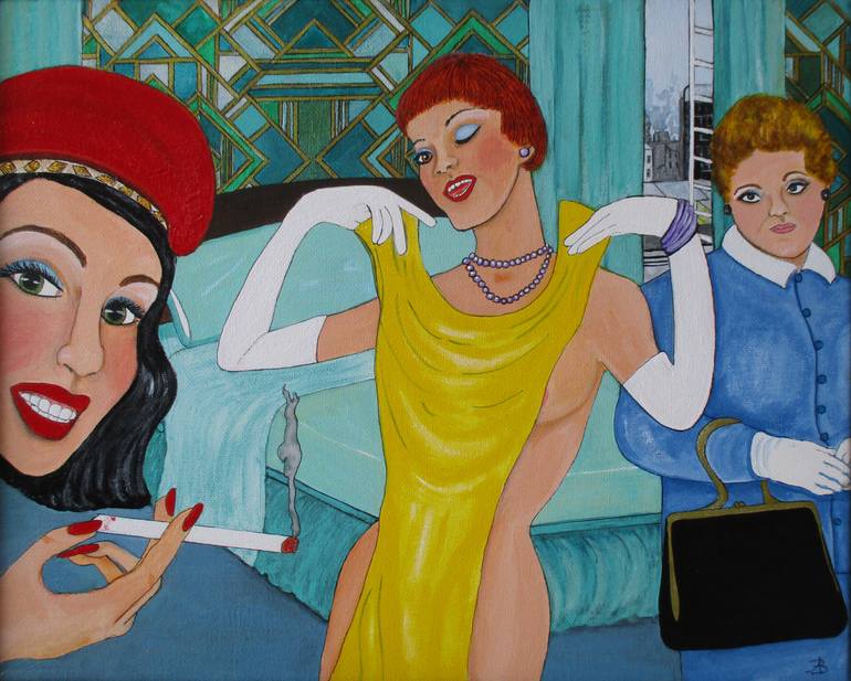 Three country gals visit the city. One buys a new yellow dress for a night on the town. Ever been on a group trip with a wet blanket? The painting measures 11 x 14 x 1 inch, is framed in a black, wooden floater frame and wired for hanging.