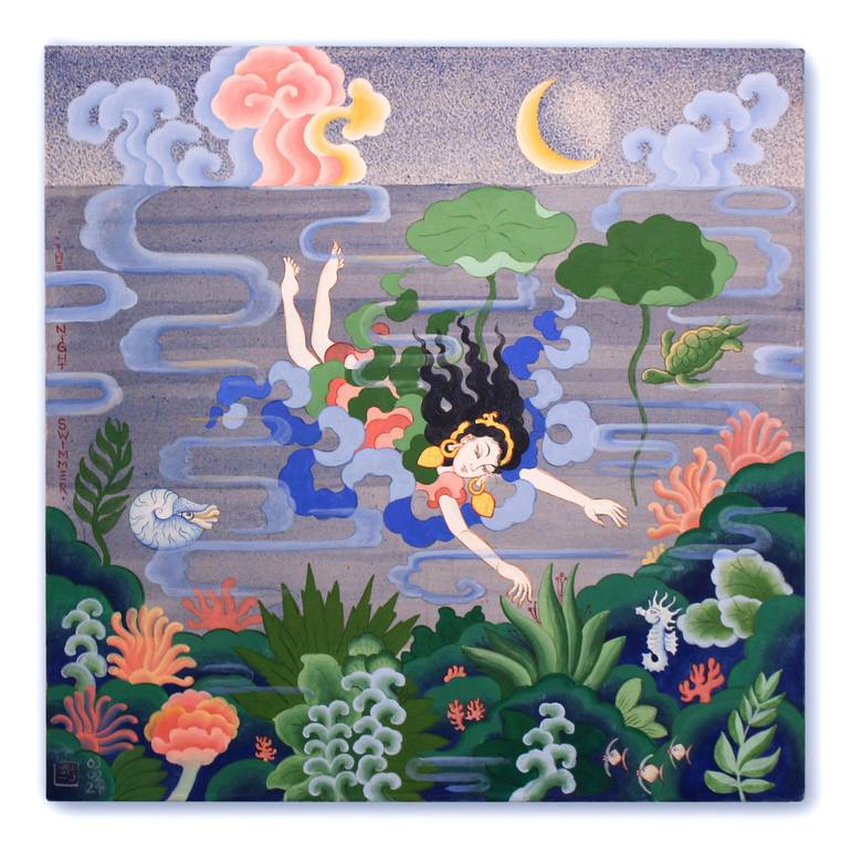 The Night Swimmer features a young female adventurer who explores the oceans of an imaginary world. The atmosphere is unearthly, fantastical, surreal, and highly detailed. I use a variety of techniques on the canvas to evoke the three-dimensionality of the scene. The sky is painted using a dot-shadi...