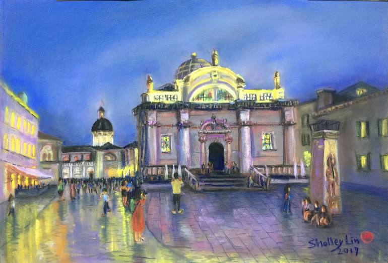 The pastel painting illustrated the romantic night view of Dubrovnik I spotted during my visit to the city. The city old town is just amazing and lively. The painting also highlights the color of the lighting on the building, the pavements and the dark blue sky.