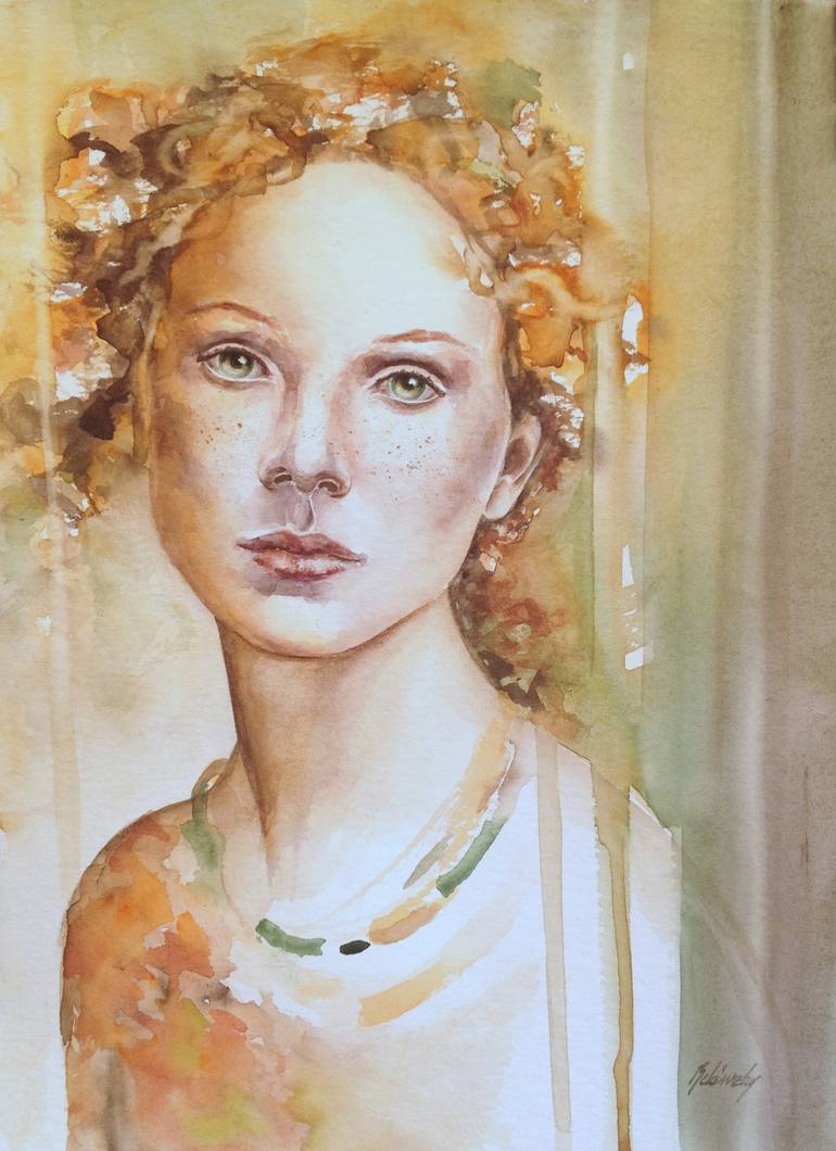 She is painted on Hahnemühle Cornwall 450gsm Watercolour Paper. It is varnished and waxed, framed in a wonderful fresh green wood frame. She was exhibited in London, Chelsea Old Town Hall, July 2015.