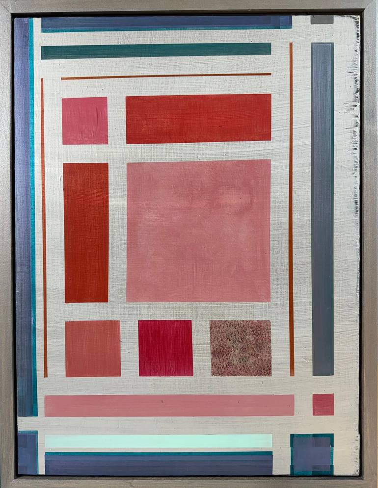 An odd couple. One of a pair. This one a geometric array of squares and rectangles in pink, orange, red and violet on a field of shimmering silver. Acrylic on plywood panel. Custom-built and painted hardwood frames. Ready to hang. Signature, title, date and artist inventory number on the back.