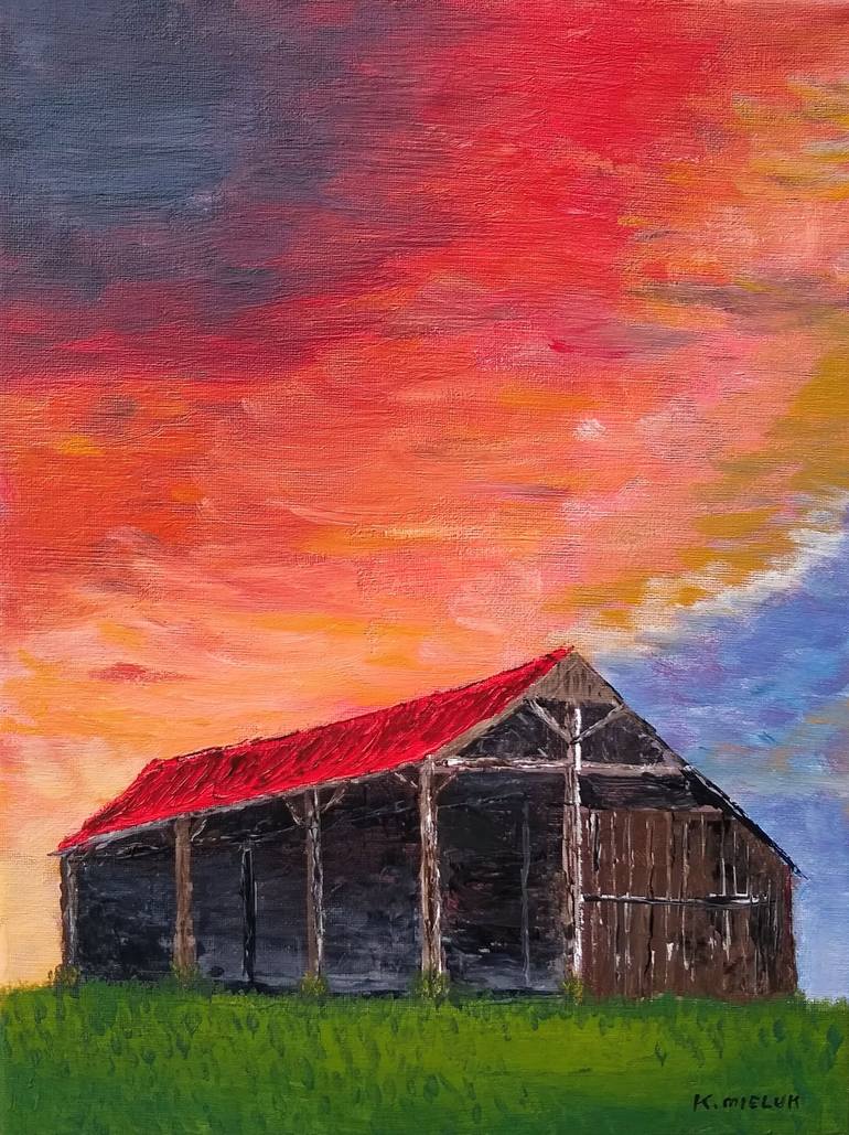 A dramatic and fiery sky over the Old Barn in the French Village of St Aubin de Cadelech which my wife and I walk past almost every day with our dog Sam. Original Painting created using Acrylic Paint on a Stretched Canvas, the work is unframed and is finished with a protective Gloss Varnish and has ...