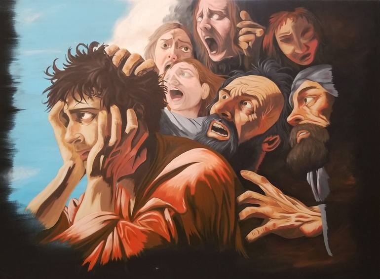 The work is inspired by people who are over worked and underappreciated. When looking at this painting you can see that the subject on the far left is being overwhelmed by people touching, pulling, shouting demands to the point where it all becomes just one tone of screaming. The subject is looki...