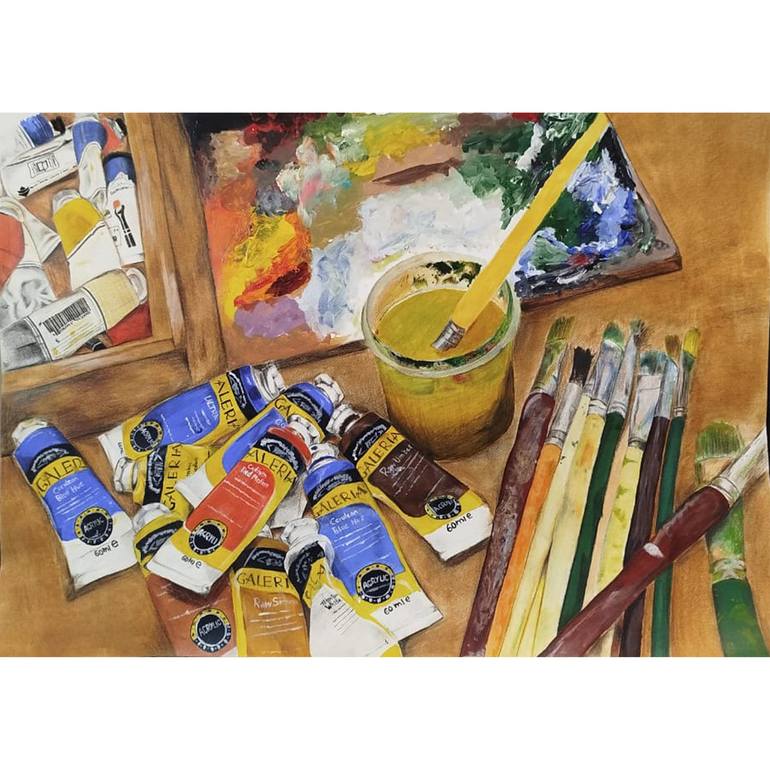 This painting embodies the quiet chaos and harmony of an artist’s process, the moment where vision meets canvas, and every stroke carries intent. The composition highlights essential tools: jars of water clouded with pigment, brushes dipped in swirling colors, and a palette rich with layered texture...