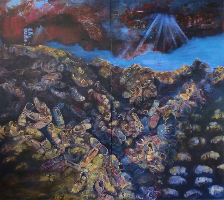 "The Paradise Of Shoes 1944" - one of the 5 painting artworks (Collection), dedicated to the history of Lithuania and lithuanian identity. To remember lithuanian intelligents, who had been exiled in 1944, imprisoned and died in Stutthof concentration camp. So many people had been passed through destruction machine, but the nation have been surrvided and still it is breathing. It is important to remember and feel our ancestry.