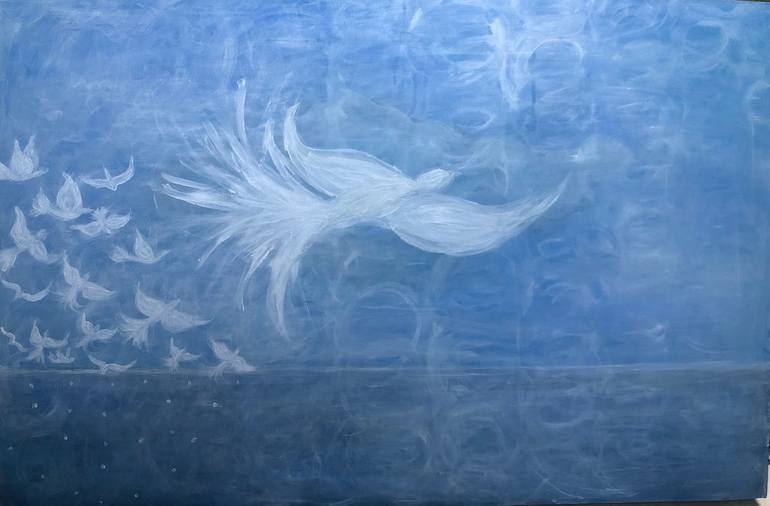 I was inspired by current events that are so sad to go deeper inside, above the fray. This image just drew itself, the dove, doves and all the blue. May it be so, may we all feel peacefulness. May there be a return to honesty, integrity and generosity.