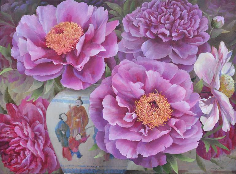 Song Qin, a bright, cheerful and even outspoken woman with a very serious attitude towards her heart was born in Guizhou province in 1943. Her hometown is in the district inhabited by many ethnic groups whose rich customs and colorful folk art excerpted a deep influence upon her which she carried with her through her studies at the Central Academy of Art and design in Beijing. Whilst working diligently to master the basic techniques of painting, Qin also followed extensive studies of Chinese and foreign art gaining a firm grasp of decorations and design which help to lay the foundation for her watercolor painting. In her work she lays special stress on the composition and the decorative qualities of the painting by which she arrives at a distinctive style of her own. This can be clearly seen in her watercolor series entitled Flower and Plants. In still-life painting many artists concentrate their efforts on truth to nature in rendering the forms, but Qin prefers to think of the image as a whole not as a composite of individual, naturalistic parts. In her words, "I paint a vase of flowers placed before a window. The blooming flowers become a large, dense patch of dots. Above the flowers there are lines to suggest the lattice of the window. The blank, white squares conger window paper, or perhaps the sky and the courtyard be on the window. They can be whatever you imagine them to be. I don't care. I am only concerned to capture the sensation of flowers and space. The space behind allows the viewers to relax."