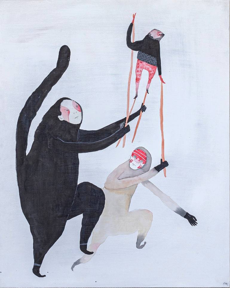 I like to paint people, possibly creatures posing as people with masks. I am influenced by Japanese folk culture, especially stories of yokai and nature spirits. The masks are perhaps a representation of how we, as humans, go about our business amongst our fellow beings.