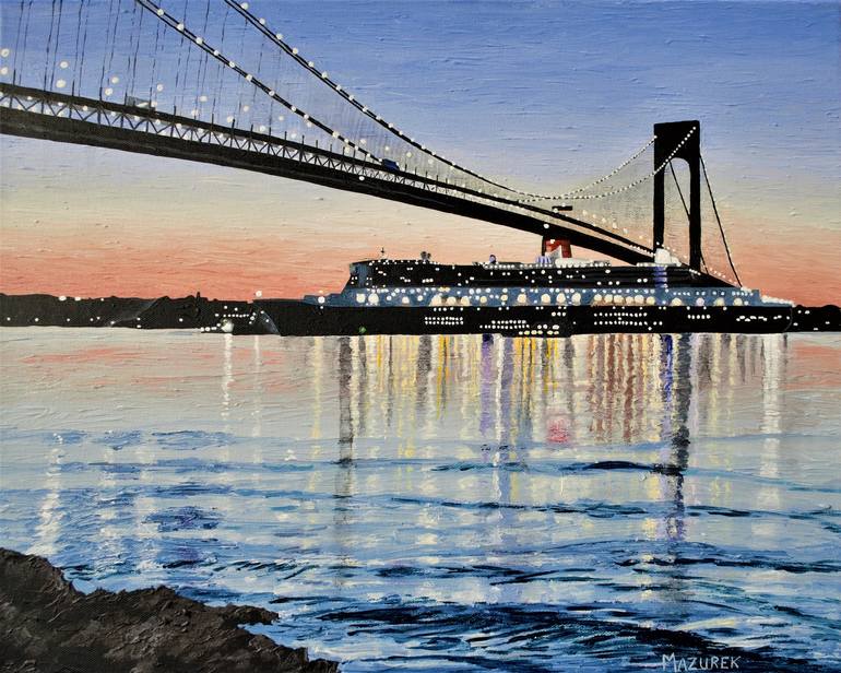 This painting is based on a photo taken by the artist, and was painted entirely on the pictured ship (Queen Mary 2) during its Christmas cruise '19/'20. The photo was taken in the early morning in July '18, when the artist camped on Staten Island near the bridge. At 4 AM he woke up to walk down to...
