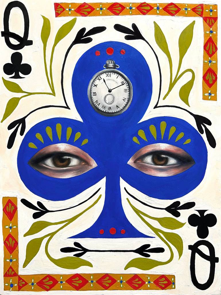 This piece is from my collection titled "The Luck of the Draw" which plays on the idea of luck and chance, following your path and breaking societal norms. It was so fun hiding symbols behind the recognizable objects, as we never know the next hand we'll be dealt in this crazy world! Painted on a c...