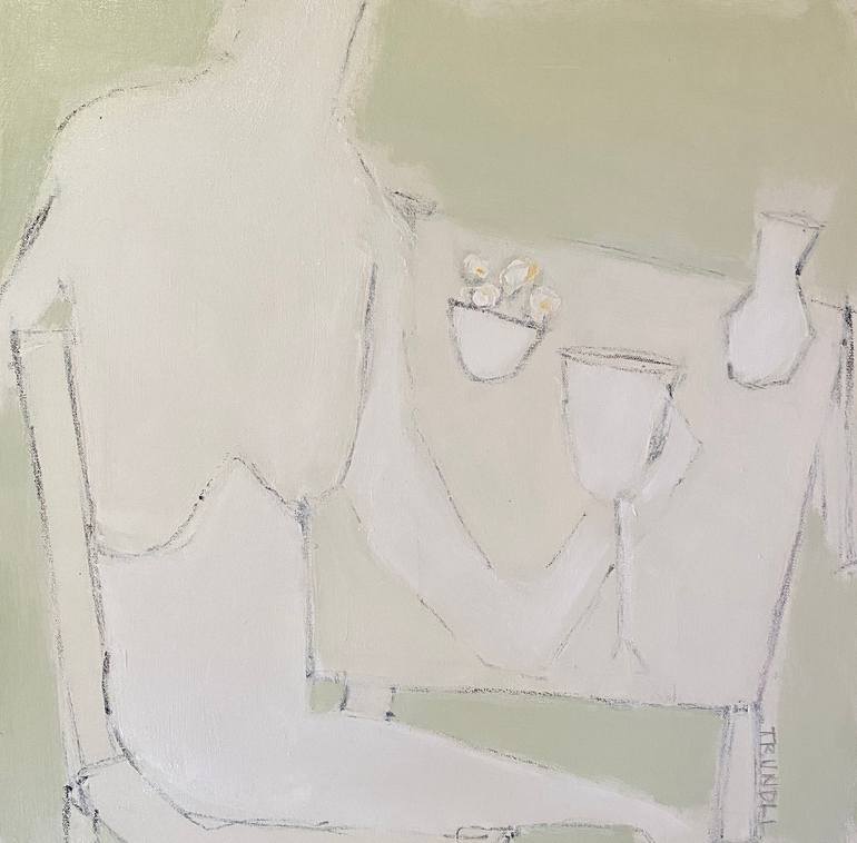 An abstracted figured seated at a table in neutral complementary colors. Evokes stillness, calm, and restoration. 24 c 24 x 1.5. Edges painted white, back wired, ready to hang.