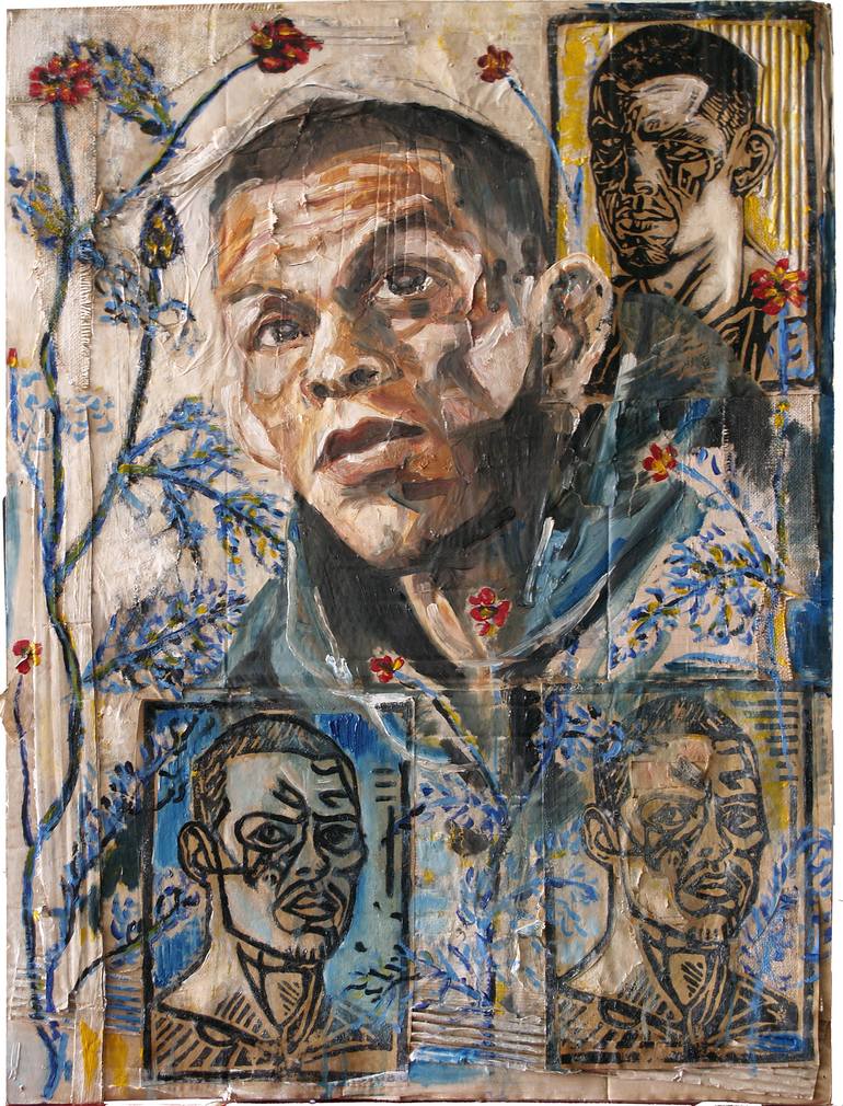 The 3 portraits on that work, were all inspired by the MMA fighter Nate Diaz' face. It is also a kind of endorsement of the tradition of the "picture in the picture" which goes all along history of art. Mixing technics, esp. paintings and engraving, on a rough surface, is also an influence from ur...
