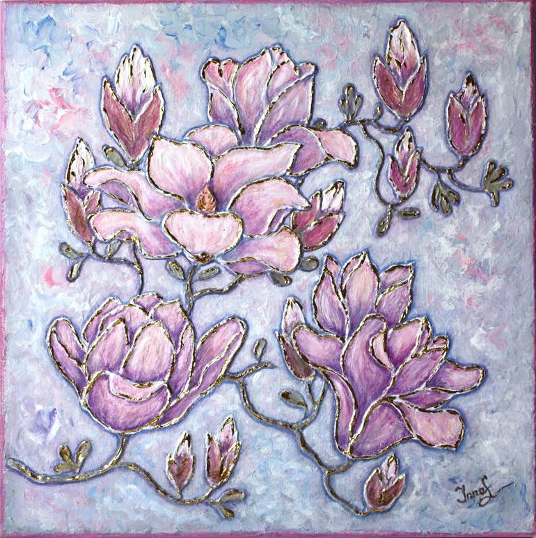 This is an original textured painting of Magnolia flowers with gold leaf details added to the flowers. The size of the canvas is 12" x 12" inches, 3/4 inches deep. Magnolia is one of my favorite flowers. For me it associated with purity, nobility, and dignity. Maybe that's why I got the idea to add...
