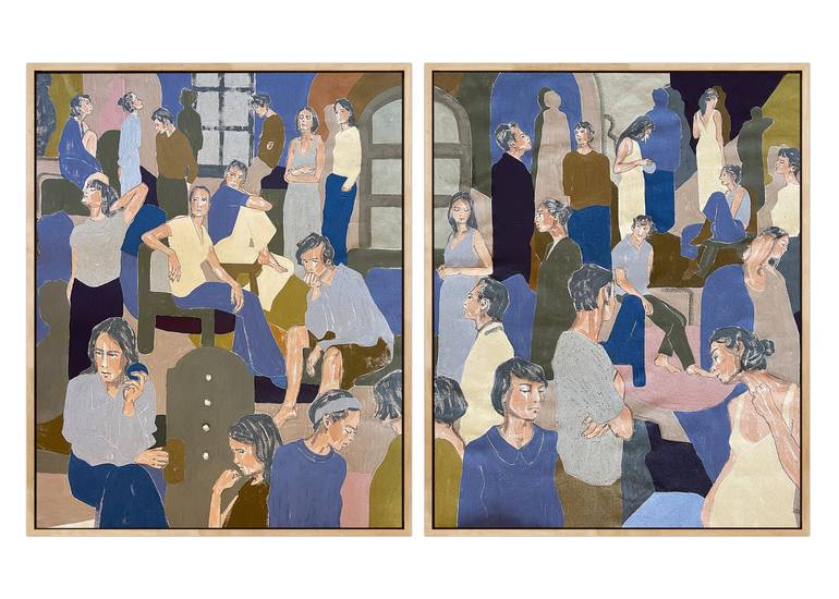 The Room No:108 Acrylic, graphite on unprimed canvas 110x130cm + 110x130cm total 220x130 cm Streched / Wooden Framed The Room Series; Notes: Space and mood of people inside are interacting. People are effective on space/place and place is on human behavior. I am very much interested in archi...