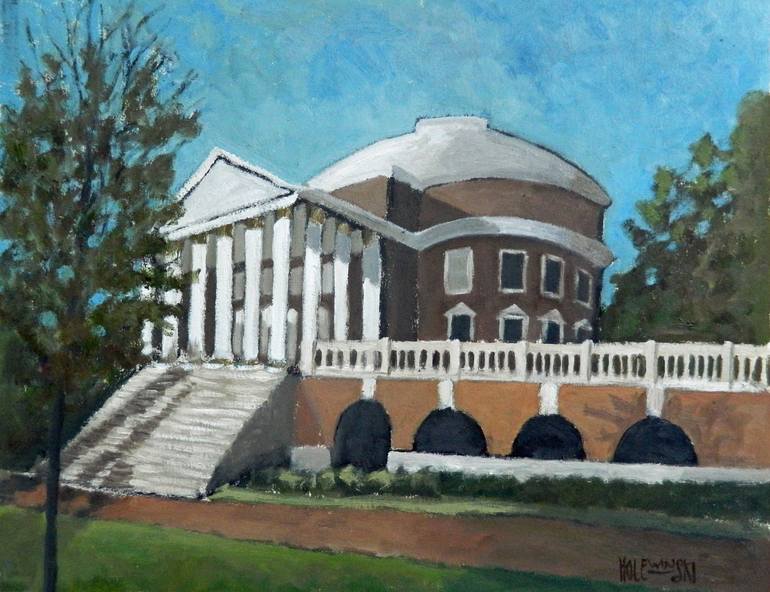 Painting is of a famous rotunda designed by Thomas Jefferson. The original university campus, buildings, and this rotunda were created by Jefferson. Painting is done in oil on 140 lb archival watercolor paper. Unmounted or trimmed. Image size is 18" x 24".