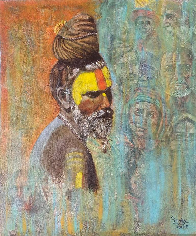 This painting portrays a serene and contemplative sage, whose face reflects spiritual calm and deep experience. The sage’s eyes reveal a glimpse of wisdom and renunciation, symbolizing the inner journey and the struggle of the soul. In the intriguing background, numerous faces emerge—each one appea...