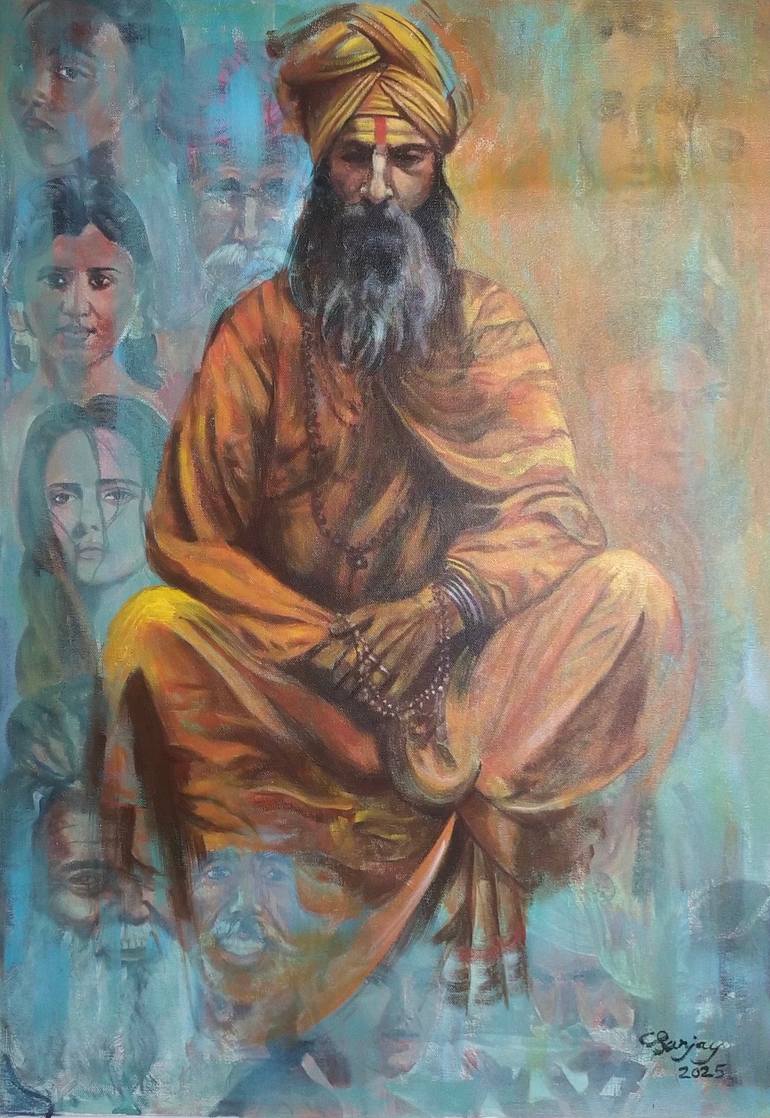 This painting portrays a serene and contemplative sage, whose face reflects spiritual calm and deep experience. The sage’s eyes reveal a glimpse of wisdom and renunciation, symbolizing the inner journey and the struggle of the soul. In the intriguing background, numerous faces emerge—each one appea...