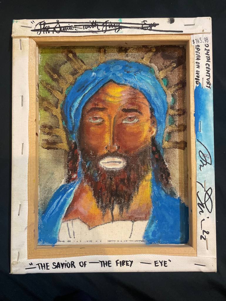 This painting is of the original titled -THE SAVIOR OF THE FIREY EYE- (painting for ref. Mid 14th century Tempera on wood) an excellent reverse Painting ? first for the artists style. Created in San Francisco 2021- 2022.