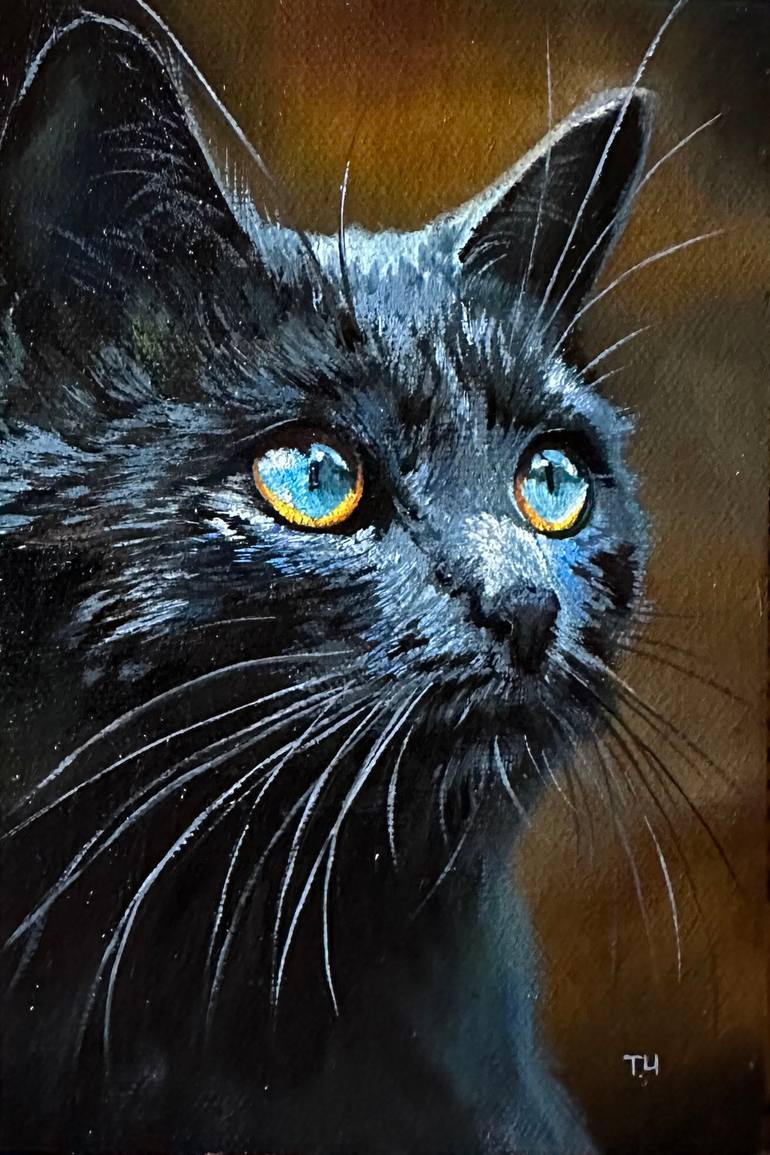 Portrait of a mysterious black cat, looking away with interest. His piercing eyes reflect the secrets of the night, and the deep color of his fur creates a sense of magic and mystery. This painting immerses you in a world where feline grace and mystery intertwine in one look.