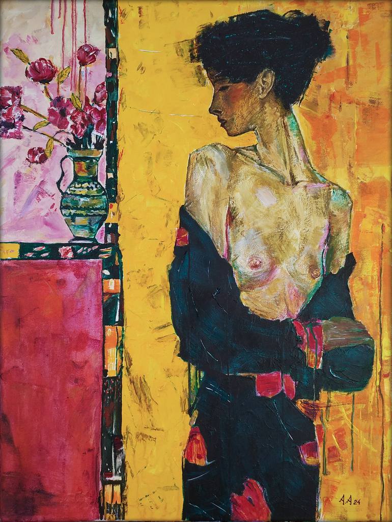 A captivating blend of elegance and warmth, The Serenity portrays a woman enveloped in a tranquil moment of introspection. Her graceful posture, complemented by soft, earthy tones and vibrant contrasts of gold, pink, and crimson, evokes a quiet strength. The vibrant bouquet of roses in a decorative ...