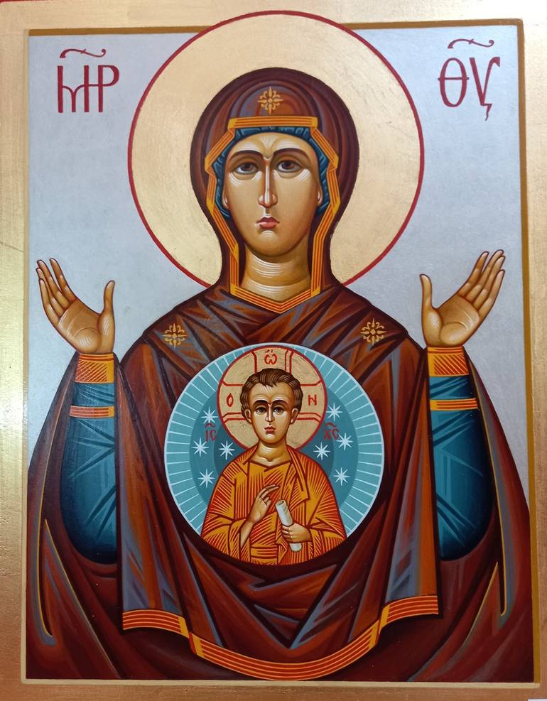 Orthodox icon with an image belonging to the icon-painting type of Orant. One of the most revered icons in Russian Orthodoxy. The icon depicts the image of the Mother of God with prayerfully raised hands (Oranta) and the Divine baby on her chest. Reports of miracles attributed to the icon of the Si...