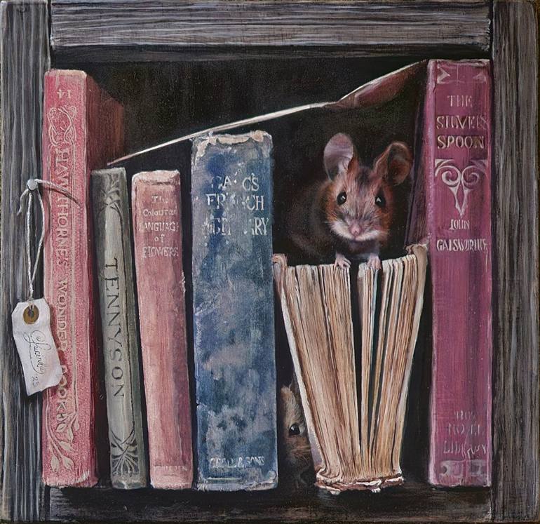 The piece depicts a small box of old books encased in a small wooden box with two mice looking inquisitively at the viewer. The titles of the books are relevant and pertinent to the scene, bringing the viewer in to the scene to explore the titles, especially the book entitled "The Silver Spoon" as t...