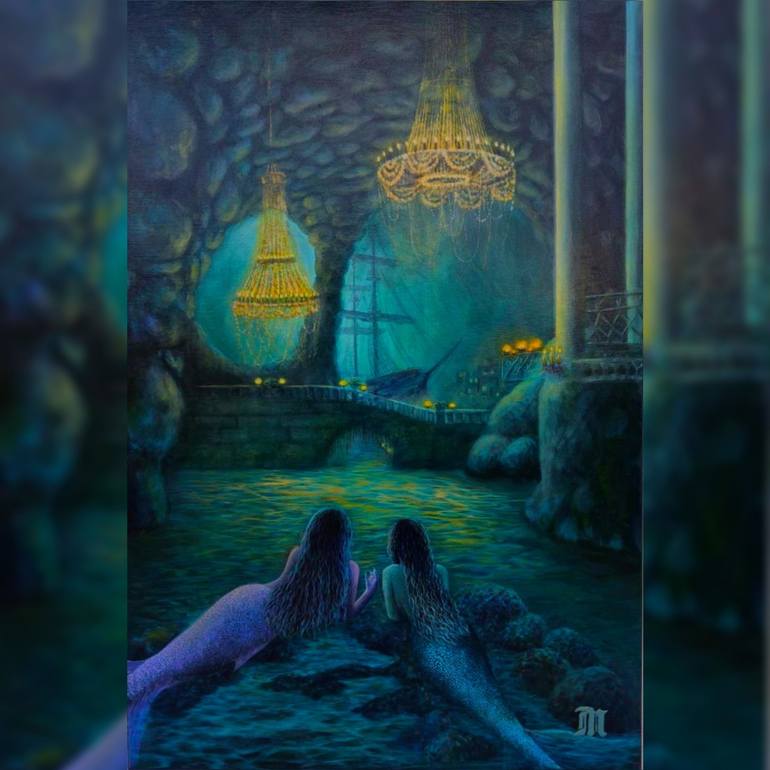 Beneath the waves, where sunlight fades into sapphire gloom, lies a forgotten hall — grand, solemn, and still. Chandeliers hang like frozen memories, catching the glow of an unknown light. The water holds its breath. "The Sirens’ Secret" is an invitation into a world where myth and memory intertwin...