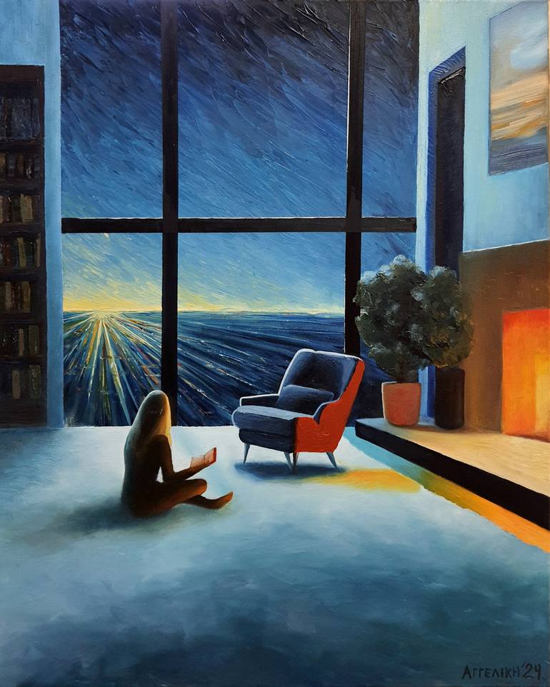 The painting guides the viewer's gaze with lines and perspective, suggesting a journey from the figure to the horizon, evoking contemplation and imagination. A contrast emerges between the warm fireplace glow and the cool night sky, creating a balanced atmosphere. The vibrant armchair and fire contr...