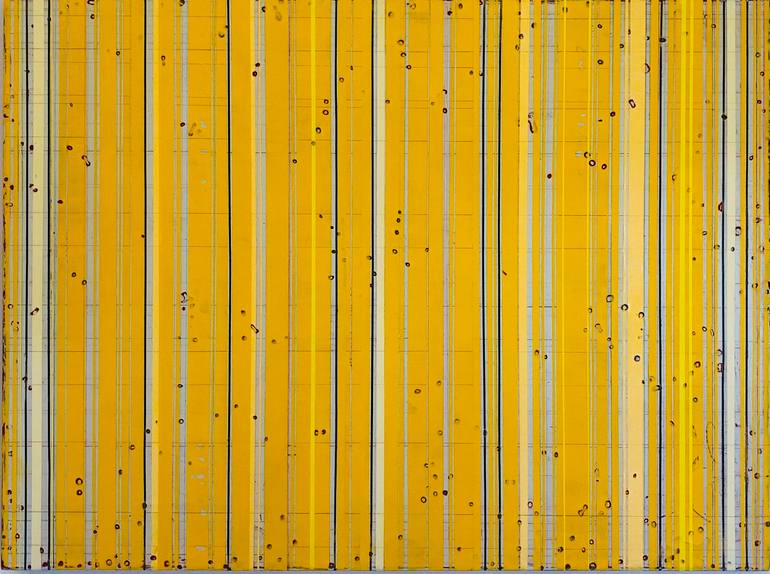 "The Song is Singing" #7 is a happy abstract painting featuring fragile yellows. White and grey stripes traverse the canvas, creating a modern stripe painting that offers a sense of bliss. Acrylic, household paint, and gesso on canvas combine to create this reductive artwork. The interplay of yello...