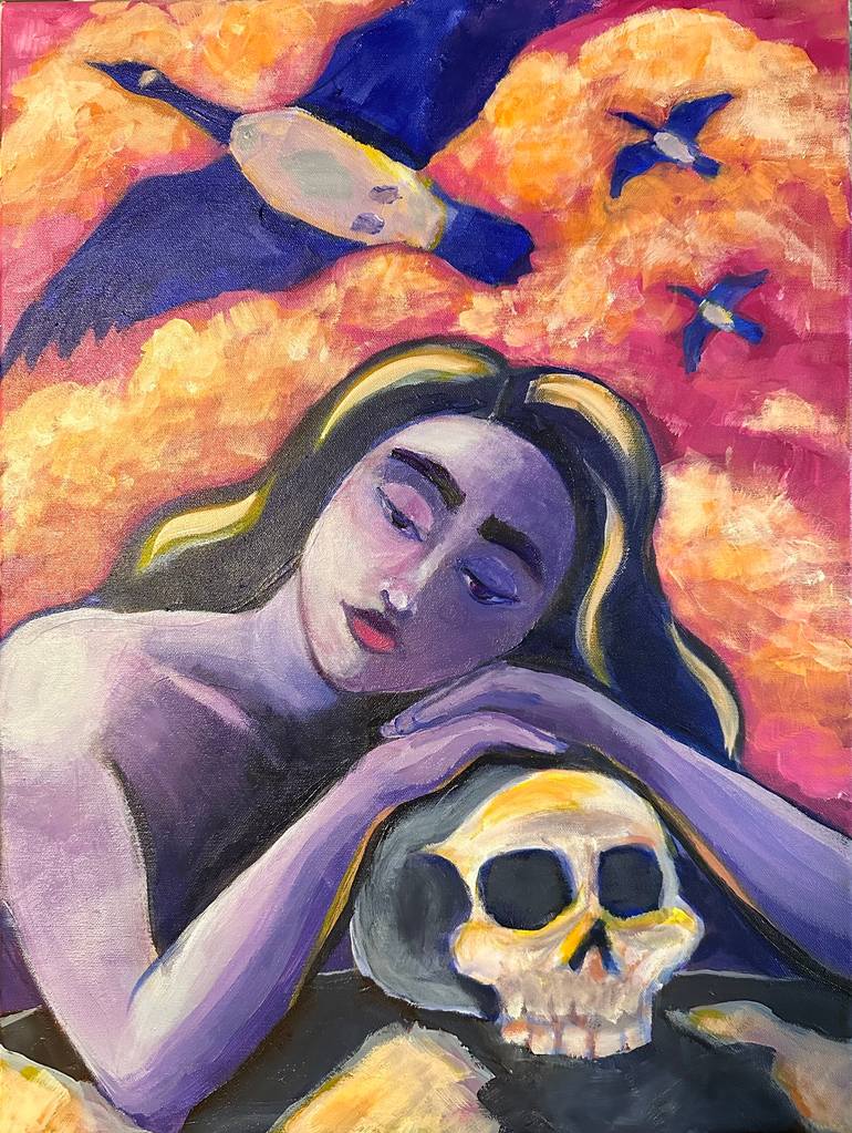 Here we find a woman, purple to the skin, contemplative and in reverie over a dedicated human skull while the birds soar overhead. The work invites deep introspection and personal reflection on the overwhelming certainty of death and the promise of divine rebirth.