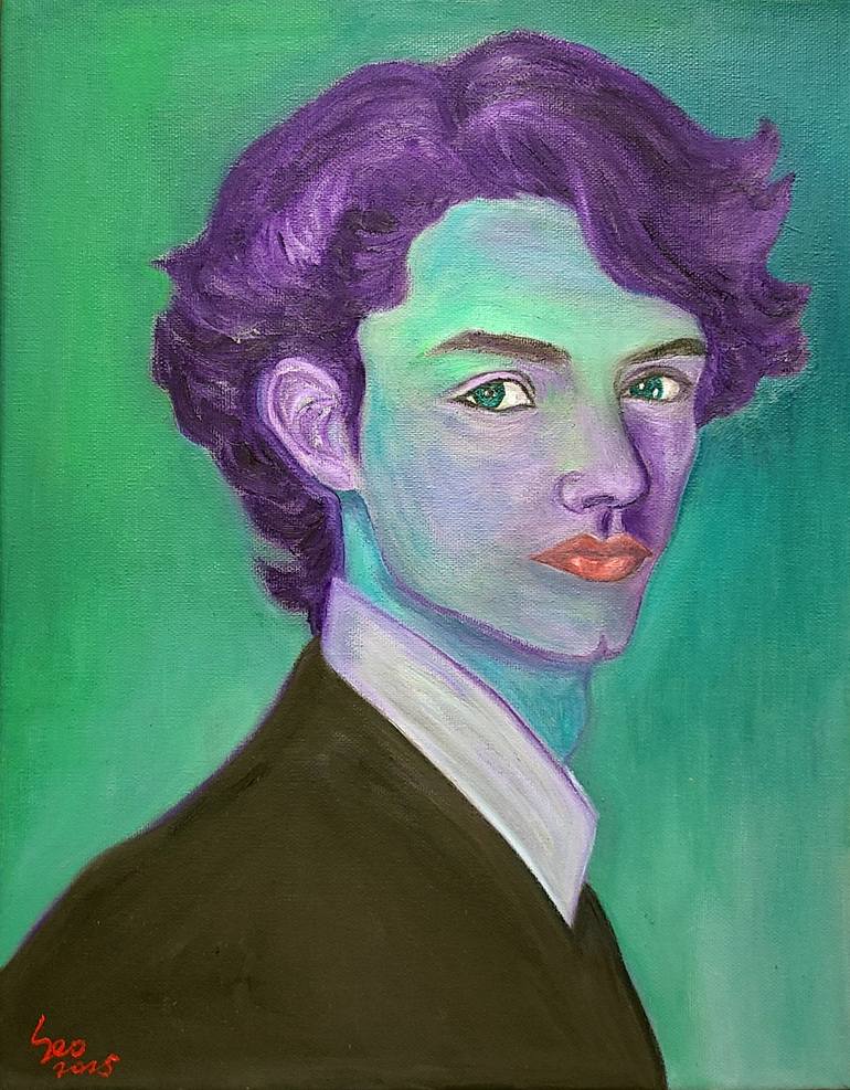 This surreal portrait captures a young man on the brink of adulthood, his gaze filled with a complex mix of emotions—curiosity, longing, skepticism, and restrained passion. His violet-toned face, contrasted against a melancholic green background, evokes an aura of innocence and quiet tension. His li...