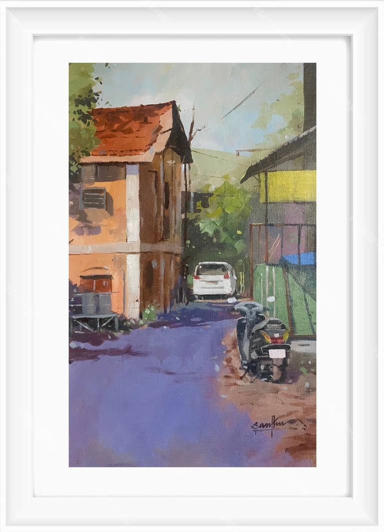 "The Story" is a captivating acrylic painting that portrays a vibrant street scene teeming with life and narrative. At its heart, a lone Scooty and a car take center stage, each vehicle suggesting a journey and story of its own. The acrylic medium brings depth and texture to the bustling street, wit...
