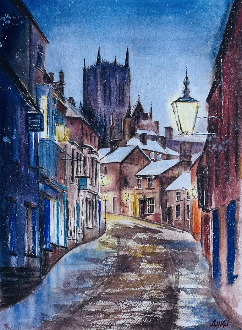 Original Watercolour Painting "The Strait. Lincoln", 2025 Series "What is the city silent about" This corner of Lincoln has always fascinated me with its atmosphere—a historic street where time seems to stand still. In the evenings, it is especially quiet, and in winter, when the snow falls, the ci...