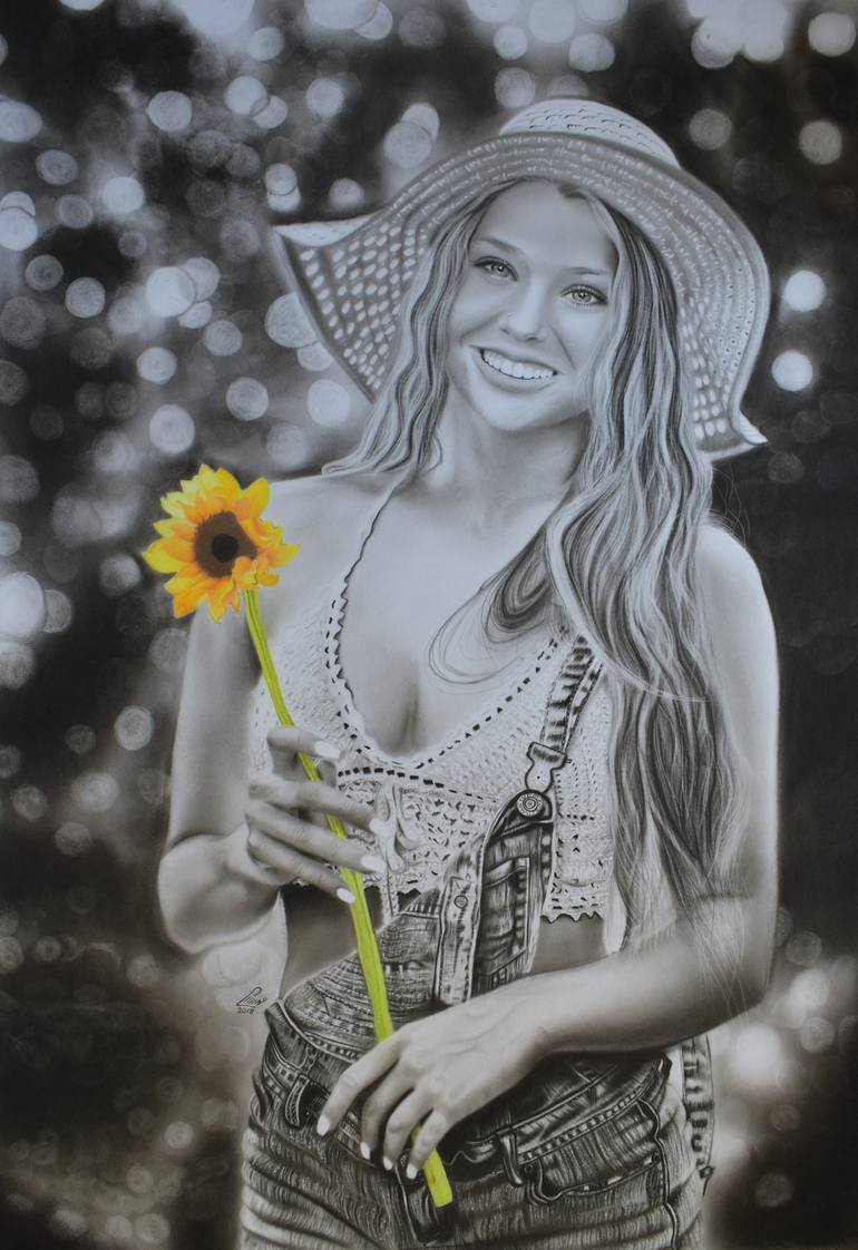 Created with a mix of graphite, black pencil, and vibrant color pencil, this piece blends classical realism with a modern conceptual touch. “The Sunflower Girl” was inspired by themes of joy, innocence, and the quiet strength found in nature and simplicity. The use of mixed media was intentional: t...