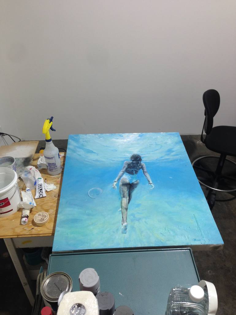 Under the surface of water where the world of light reflects across a swimmer in a photo I wish I had captured myself, is what I hoped this piece could emulate. Besides capturing that moment of mysterious bluish greens and yellows mixing together and competing for their independence simultaneously, the task immersed myself into painting it with a very detailed observance. This is why I think the faint pencil lines in some of the bubbles and swirls, some even around the figure, are part of the dynamic essence I ended up leaving with thicker under painting drips and spills allowing the subject matter to likewise blend and dual with the surface. I was pleased with the result finding this painting a subtle and calm battle in this way.