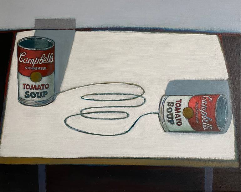 A simple table top composition with two Campbells Soup cans carefully arranged. As well as being a reference to Andy Warhol the work references a simple game children played with the cans attached by string acting as a telephone. I don't remember it actually working. Colour relationships, line, tone...