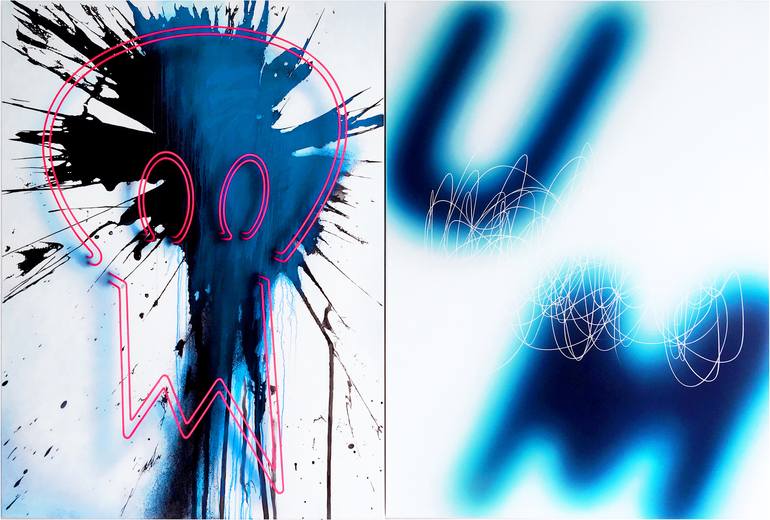 Acrylic on canvas. Total size of artwork 240cm x 160cm. A painting about duality. A diptych over two canvases each measuring 160cm x 120cm. The elements of the right canvas recede into infinity - with a chaotic delicately painted scribble hanging in mid-space - while the elements of the left canvas...