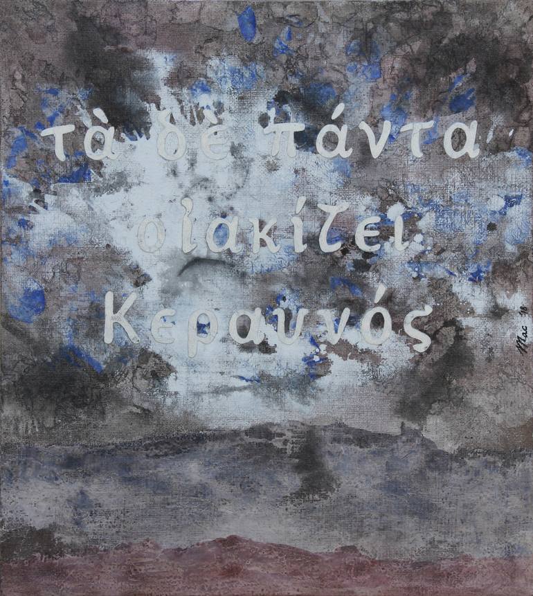 Acrylic,plaster, aluminium leaf on jute canvas. Stretched on handcrafted frame, ready to hang. Ancient Greek sentence of Heraclitus of Ephesus ( 535 B.C. - 475 B.C. ). Aphorism n. 64.