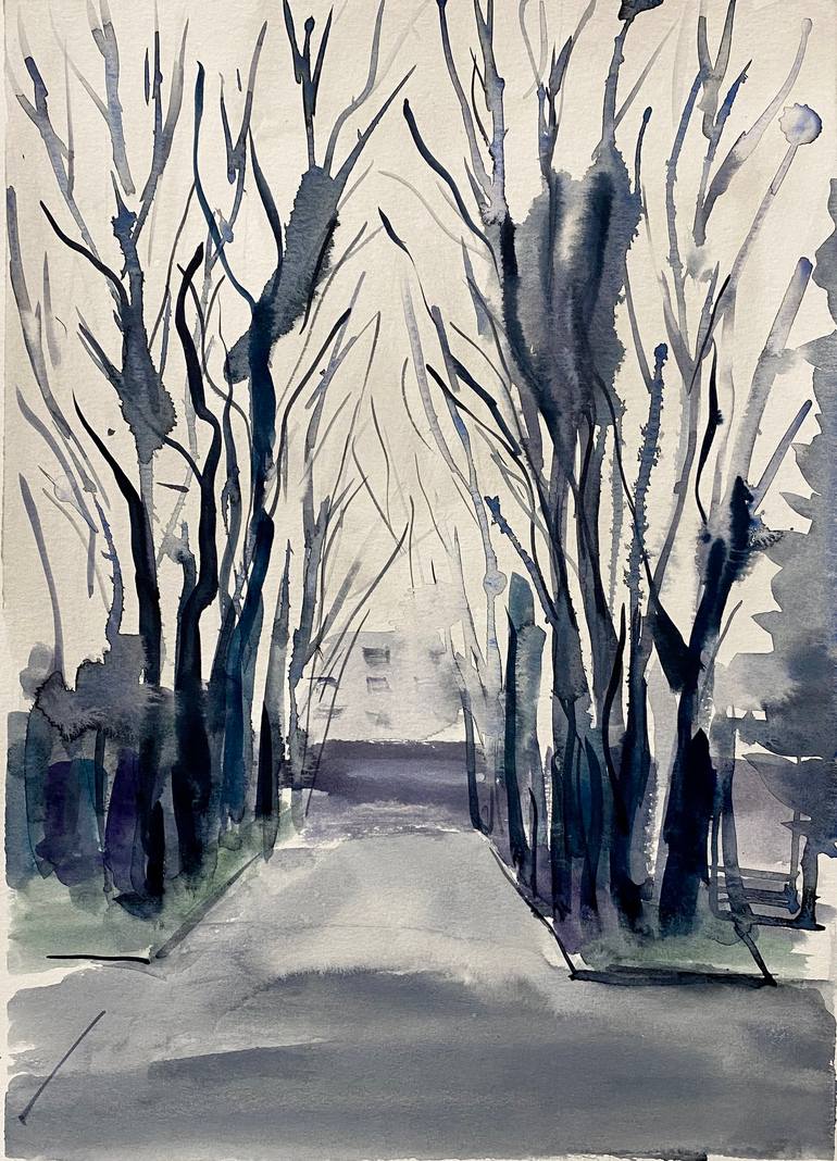 This black-and-white watercolor painting depicts a fascinating corridor of trees, whose bare branches frame a road stretching into the distance. The rhythmic arrangement of the trunks creates a natural tunnel that leads the eye to the invisible horizon. The sharp contrast between the dark silhouette...