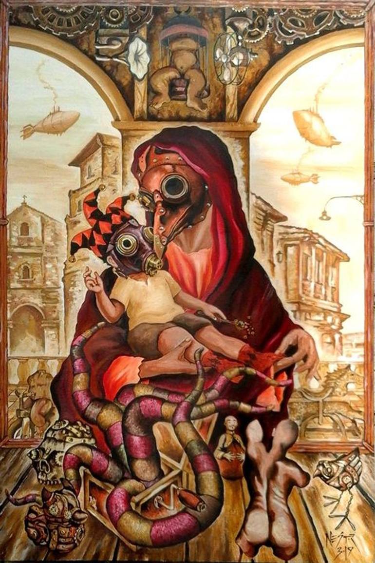 Title: The Toy Peddler Medium: Oil on Canvas Size: 36in X 24in Year: 2019 Artist Statement: My first steampunk madonna and child circa 2019. This was my tribute to Aling Lualhati, a single mother who tirelessly created and peddled toys to nurture her son. With such creative mind, she was able to de...