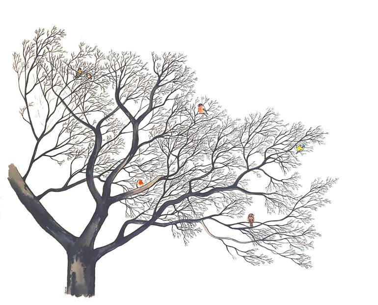 This is the third one of my 'Birdy Trees' series, a collection of artworks that combining watercolour and ink wants to depict the contrast between the dark trees and the colourful birds brightenning up the composition, as it happens so often in nature itself. I use Arches paper 300 gsm,100% cotton –...