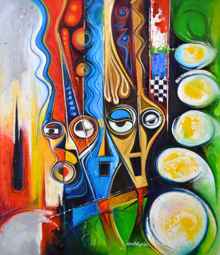 Born in 1968 in Ado-Ekiti Nigeria, Olumide discovered his love of art at a young age through his father and Uncle (Prof. Michael Olusegun Adejemilua) and his "Ona Art Movement"..he was later influenced by his painting lecturer Prof. Tola Wewe and classmate namesake Dr. Olumide Ayeni. After 20 years as Visual Art Teacher, Olumide returned to his easel and brushes on a full time basis. My paintings are dialogues of my mind as viewed, perceived or seen from things, lifestyles of the people and the worlds around me. When I captured the images in my conscious mind, I find a special way to analyze and engage those images carefully into my canvas. Through this free form approach to my paintings, I explore the use of balance, lines, shapes, colours and heavy textures and give a lot of chances and freedom to experiment with my colours which results in real unconscious juxtapositions of colours and other elements in the whole work.