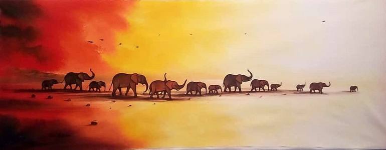 This is a painting of elephants on their way to a destination. I used acrylics which I put on canvas. The artwork clearly shows how beautiful it is when nature and wildlife are together. I think the viewers of this art work will be impressed by the colors which were used.