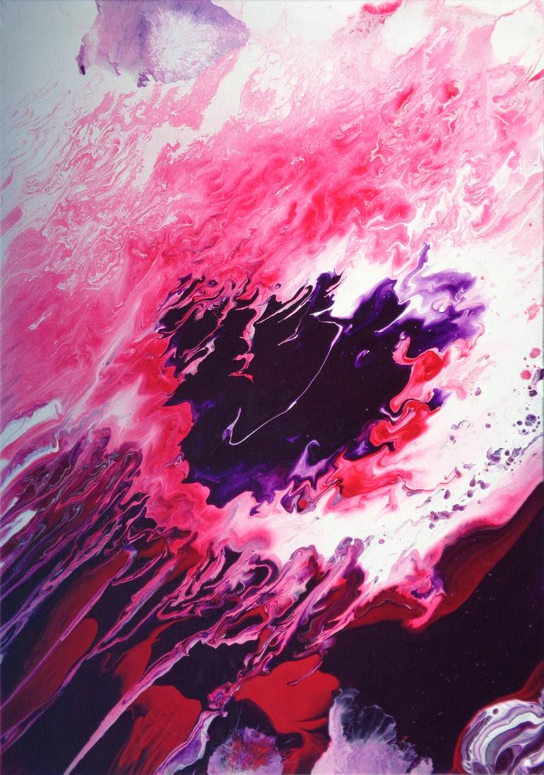 This piece is a completely unique and original abstract fluid painting on canvas. The shine of the pouring gives the painting the appearance of being wet and different forms and textures reflect to the surface. It has a cosmic energy, a perfect accent piece for a right place. The painting is painte...