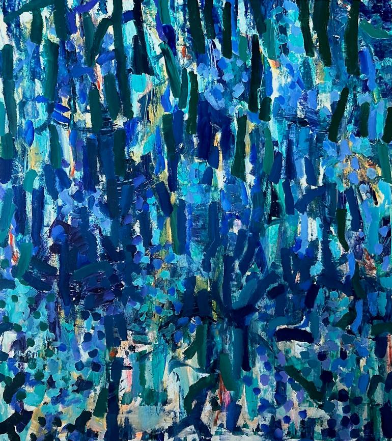 The painting, The Vertical Ocean, is a mesmerizing expanse of layered blue and blue-green hues, created with bold, vertical brushstrokes that evoke the depth and movement of the sea. The large canvas is saturated with color, immersing the viewer in its rhythmic interplay of light and shadow. Hints o...