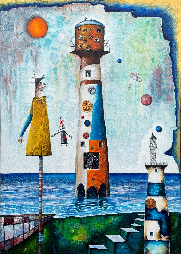 The most recent addition to the 'Watchtower' series. I've been enjoying the joyful playfulness and whimsical/surrealistic nature of these paintings. This whole series of paintings are an attempt to celebrate the ever present and dispassionate 'observer' aspect of our consciousness. The silent witnes...
