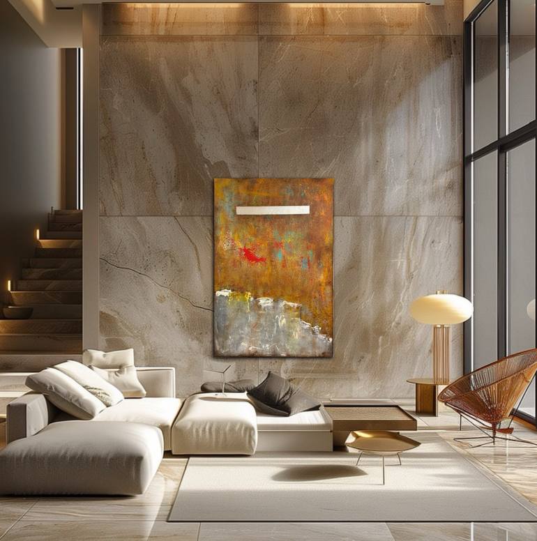 This painting is done in an abstract style, evoking a sense of warmth and texture. The dominant tones are earthy, with shades of brown, ochre, and golden hues, creating an impression of natural harmony. Bright splashes of red and turquoise add energy and contrast, reminiscent of the dynamics of life...