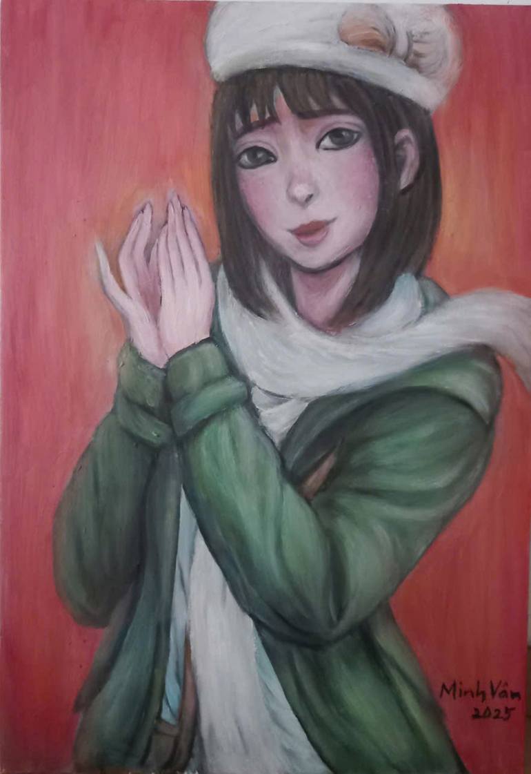 Oil painting on stretched canvas. A portrait of woman wearing warm clothes during winter.