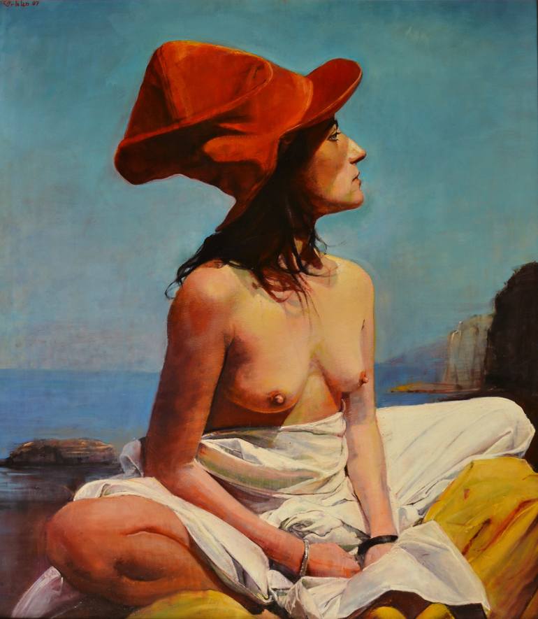 Video link : https://www.youtube.com/watch?v=QSqQu7pYBwY A Rafaelesque subject where the composition is framed within the pyramidal shape and where blue and red are present as in Rafael's "Madonnas". Theatrical scene with our model from the front displaying her red hat. Classic posture of pictoria...